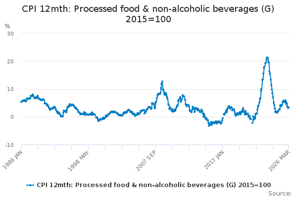 Download this time seriesCPI 12mth: Processed food & non-alcoholic beverages (G) 2015=100