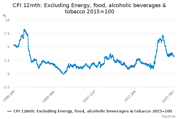 Download this time seriesCPI 12mth: Excluding Energy, food, alcoholic beverages & tobacco 2015=100