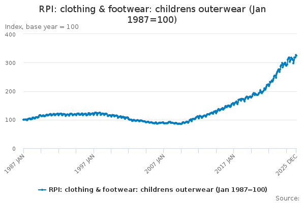 Download this time seriesRPI: clothing & footwear: childrens outerwear (Jan 1987=100)