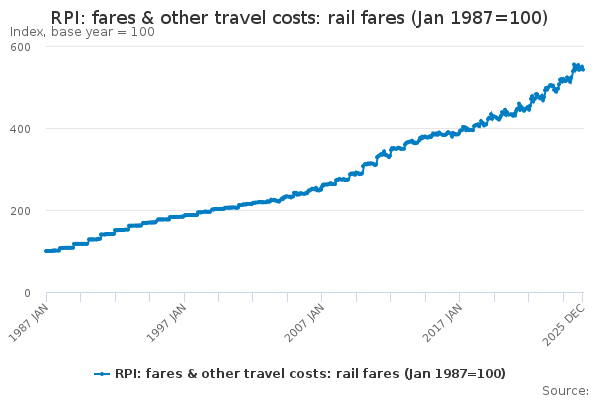 Download this time seriesRPI: fares & other travel costs: rail fares (Jan 1987=100)