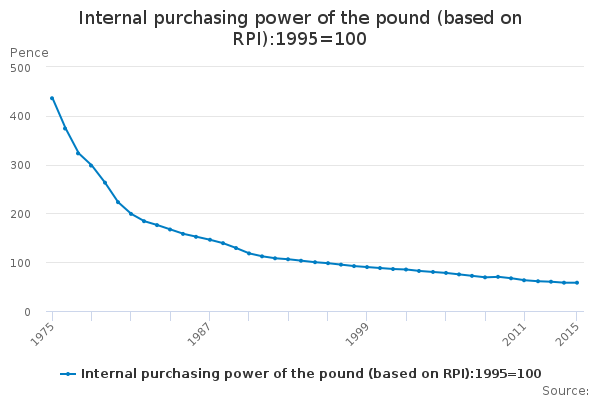 Download this time seriesInternal purchasing power of the pound (based on RPI):1995=100