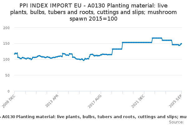 Download this time seriesPPI INDEX IMPORT EU - A0130 Planting material: live plants, bulbs, tubers and roots, cuttings and slips; mushroom spawn 2015=100