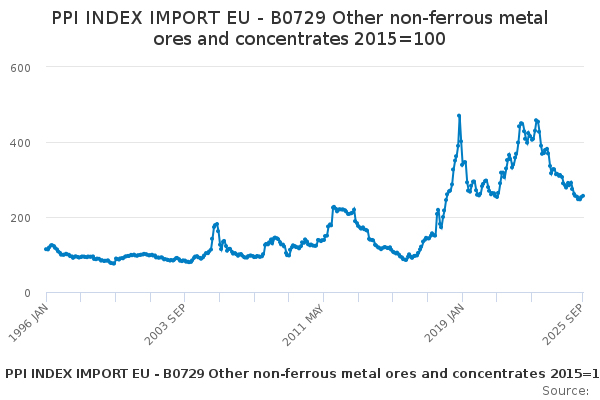 Download this time seriesPPI INDEX IMPORT EU - B0729 Other non-ferrous metal ores and concentrates 2015=100