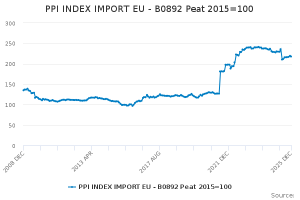 Download this time seriesPPI INDEX IMPORT EU - B0892 Peat 2015=100