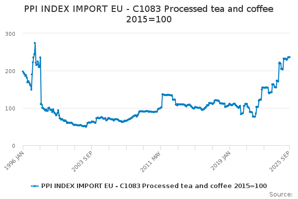 Download this time seriesPPI INDEX IMPORT EU - C1083 Processed tea and coffee 2015=100