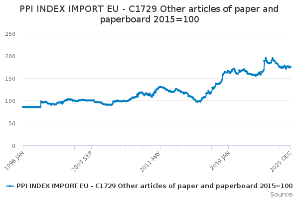 Download this time seriesPPI INDEX IMPORT EU - C1729 Other articles of paper and paperboard 2015=100
