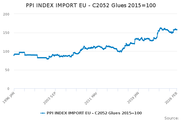 Download this time seriesPPI INDEX IMPORT EU - C2052 Glues 2015=100