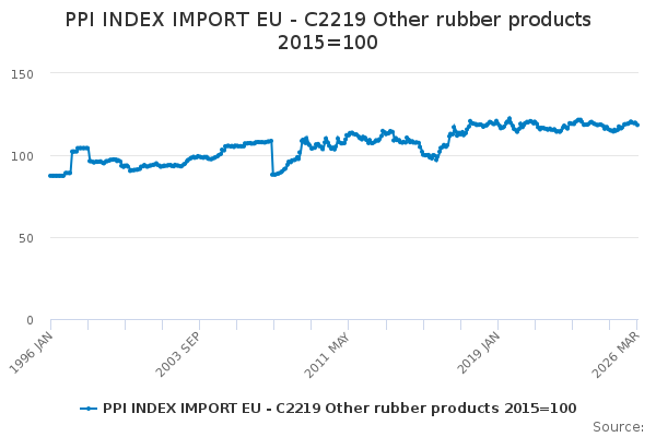 Download this time seriesPPI INDEX IMPORT EU - C2219 Other rubber products 2015=100