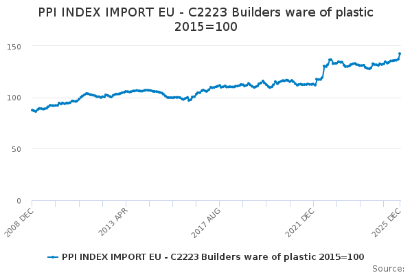 Download this time seriesPPI INDEX IMPORT EU - C2223 Builders ware of plastic 2015=100