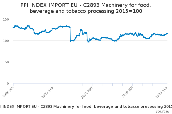 Download this time seriesPPI INDEX IMPORT EU - C2893 Machinery for food, beverage and tobacco processing 2015=100