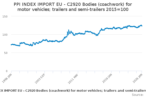 Download this time seriesPPI INDEX IMPORT EU - C2920 Bodies (coachwork) for motor vehicles; trailers and semi-trailers 2015=100