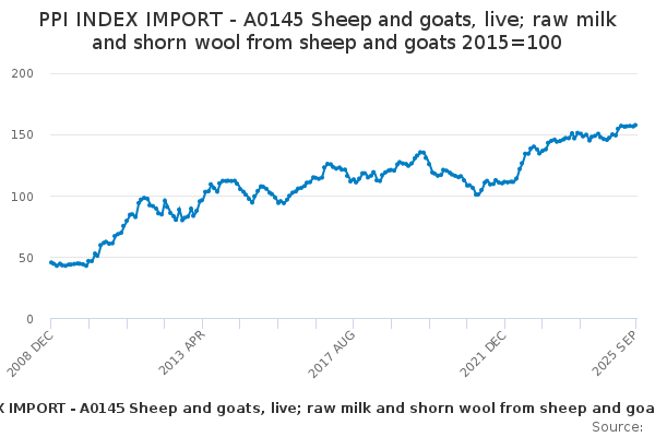 Download this time seriesPPI INDEX IMPORT - A0145 Sheep and goats, live; raw milk and shorn wool from sheep and goats 2015=100