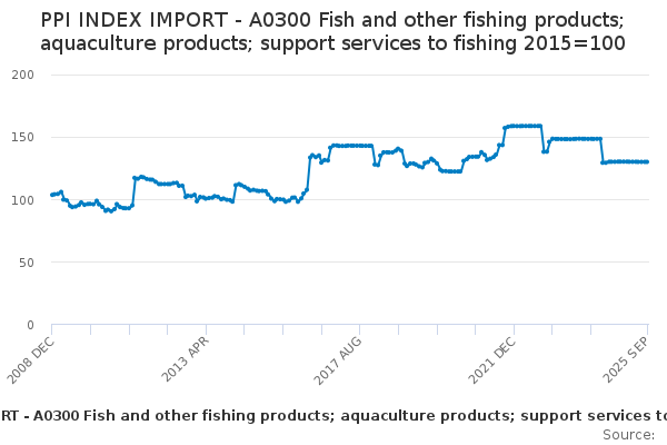Download this time seriesPPI INDEX IMPORT - A0300 Fish and other fishing products; aquaculture products; support services to fishing 2015=100