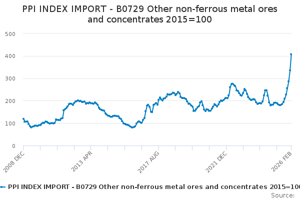 Download this time seriesPPI INDEX IMPORT - B0729 Other non-ferrous metal ores and concentrates 2015=100