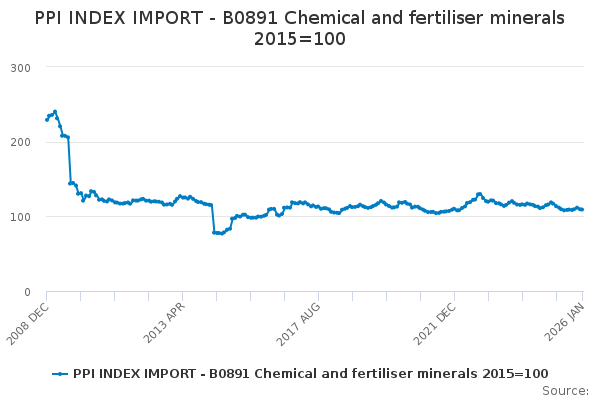 Download this time seriesPPI INDEX IMPORT - B0891 Chemical and fertiliser minerals 2015=100