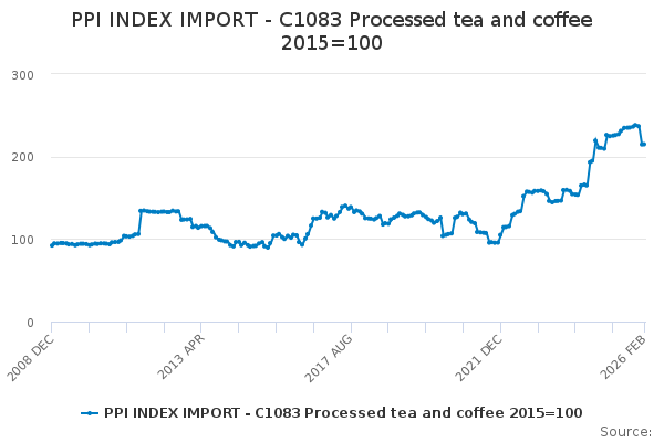 Download this time seriesPPI INDEX IMPORT - C1083 Processed tea and coffee 2015=100