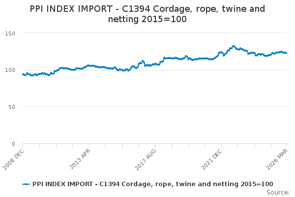 Download this time seriesPPI INDEX IMPORT - C1394 Cordage, rope, twine and netting 2015=100