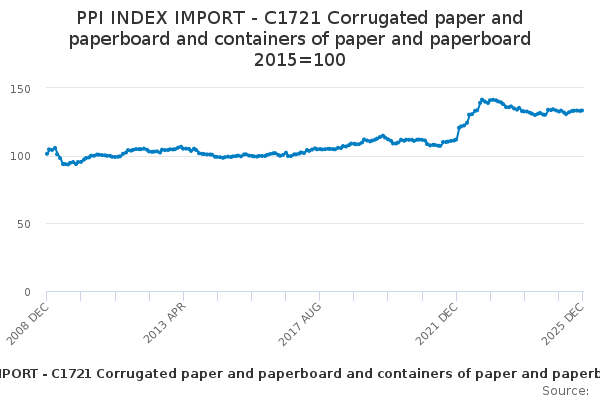 Download this time seriesPPI INDEX IMPORT - C1721 Corrugated paper and paperboard and containers of paper and paperboard 2015=100