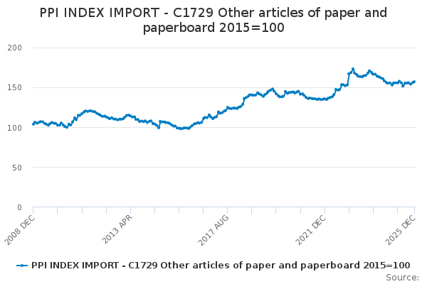 Download this time seriesPPI INDEX IMPORT - C1729 Other articles of paper and paperboard 2015=100