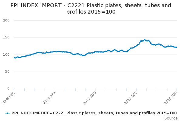 Download this time seriesPPI INDEX IMPORT - C2221 Plastic plates, sheets, tubes and profiles 2015=100