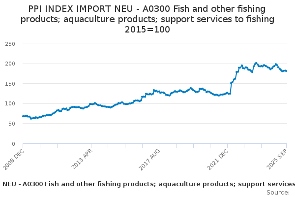 Download this time seriesPPI INDEX IMPORT NEU - A0300 Fish and other fishing products; aquaculture products; support services to fishing 2015=100