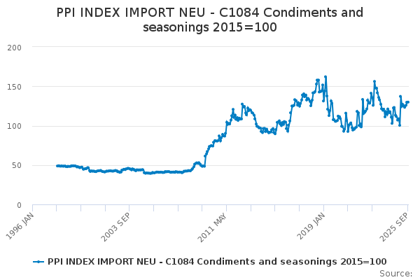 Download this time seriesPPI INDEX IMPORT NEU - C1084 Condiments and seasonings 2015=100