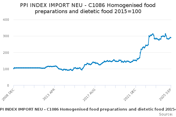 Download this time seriesPPI INDEX IMPORT NEU - C1086 Homogenised food preparations and dietetic food 2015=100