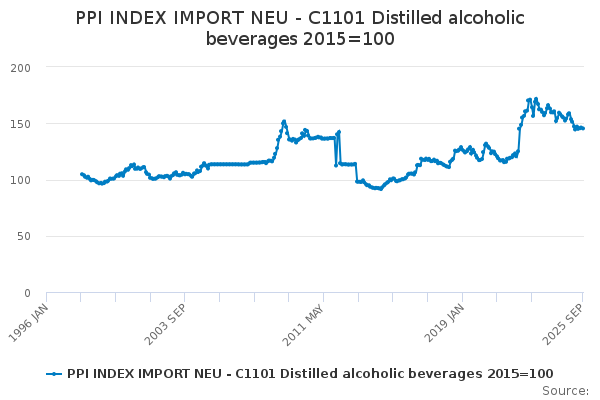 Download this time seriesPPI INDEX IMPORT NEU - C1101 Distilled alcoholic beverages 2015=100