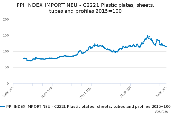 Download this time seriesPPI INDEX IMPORT NEU - C2221 Plastic plates, sheets, tubes and profiles 2015=100