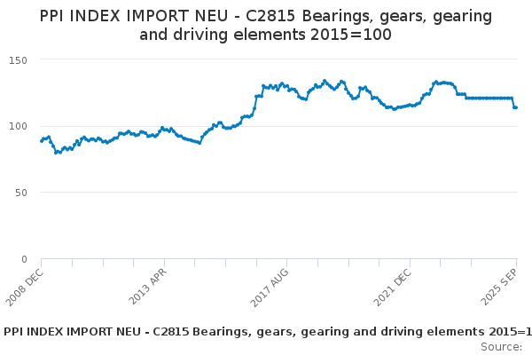 Download this time seriesPPI INDEX IMPORT NEU - C2815 Bearings, gears, gearing and driving elements 2015=100