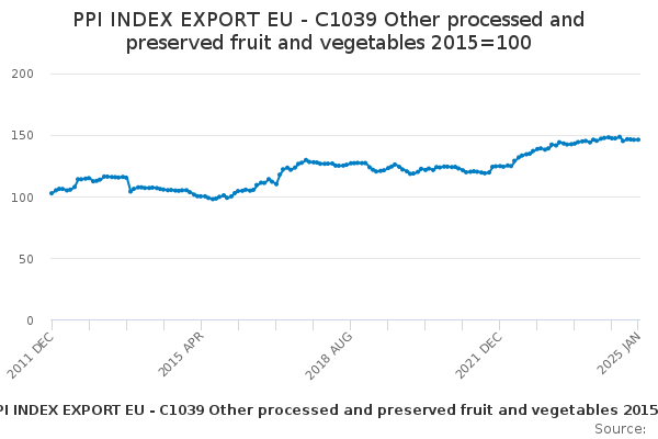Download this time seriesPPI INDEX EXPORT EU - C1039 Other processed and preserved fruit and vegetables 2015=100