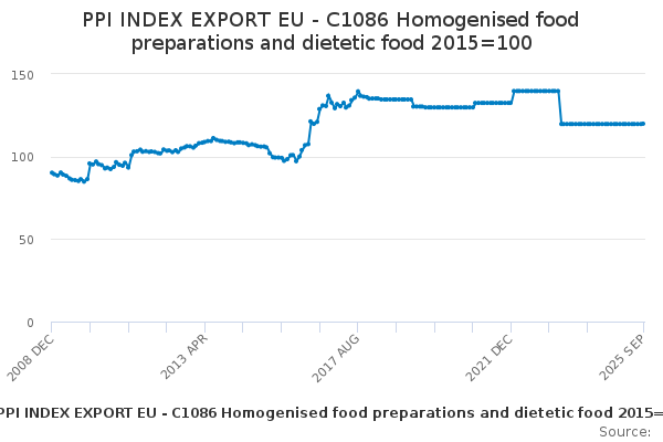 Download this time seriesPPI INDEX EXPORT EU - C1086 Homogenised food preparations and dietetic food 2015=100
