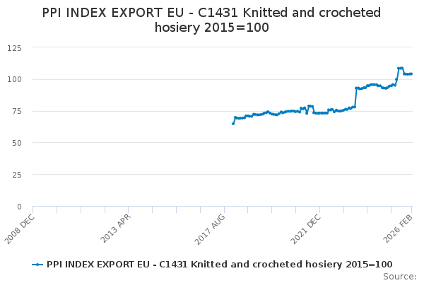 Download this time seriesPPI INDEX EXPORT EU - C1431 Knitted and crocheted hosiery 2015=100