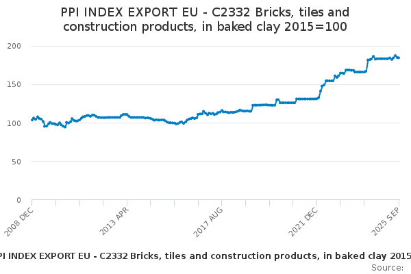 Download this time seriesPPI INDEX EXPORT EU - C2332 Bricks, tiles and construction products, in baked clay 2015=100