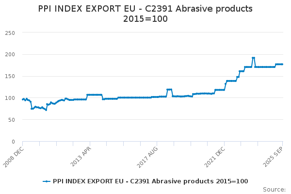 Download this time seriesPPI INDEX EXPORT EU - C2391 Abrasive products 2015=100
