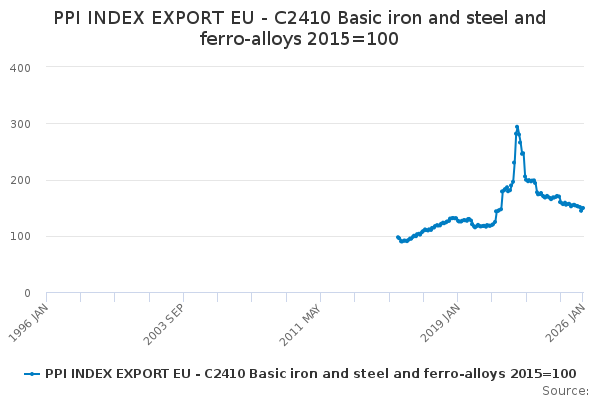 Download this time seriesPPI INDEX EXPORT EU - C2410 Basic iron and steel and ferro-alloys 2015=100
