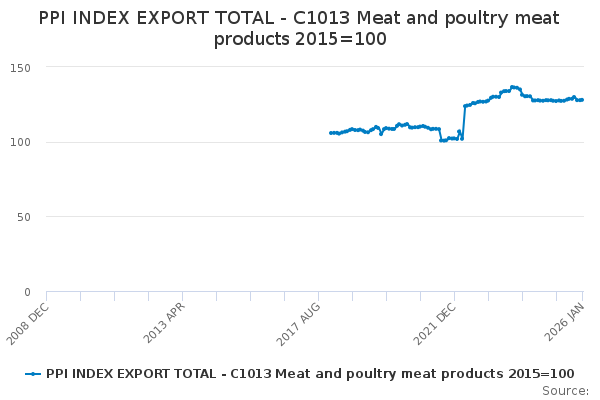 Download this time seriesPPI INDEX EXPORT TOTAL - C1013 Meat and poultry meat products 2015=100