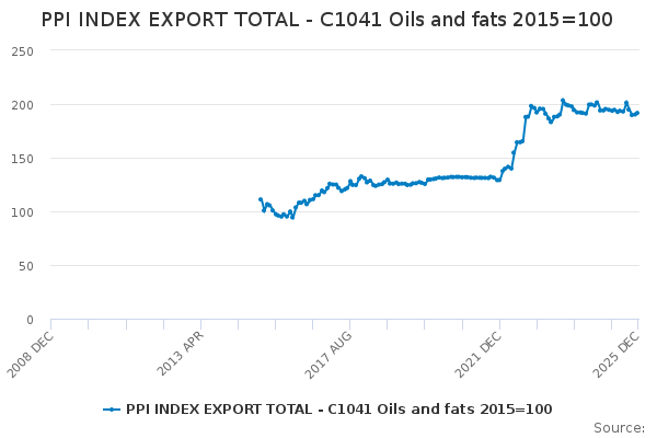 Download this time seriesPPI INDEX EXPORT TOTAL - C1041 Oils and fats 2015=100