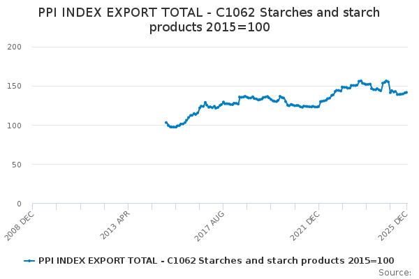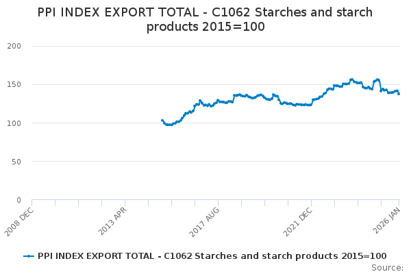 Download this time seriesPPI INDEX EXPORT TOTAL - C1062 Starches and starch products 2015=100