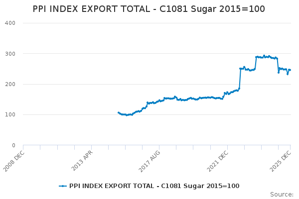 Download this time seriesPPI INDEX EXPORT TOTAL - C1081 Sugar 2015=100