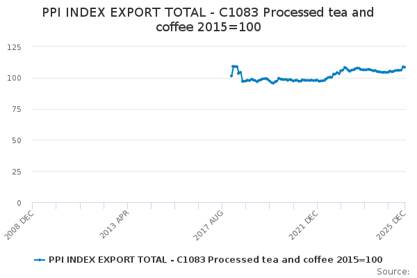 Download this time seriesPPI INDEX EXPORT TOTAL - C1083 Processed tea and coffee 2015=100