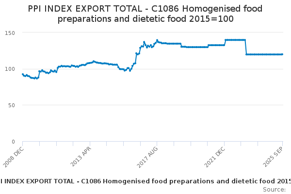 Download this time seriesPPI INDEX EXPORT TOTAL - C1086 Homogenised food preparations and dietetic food 2015=100