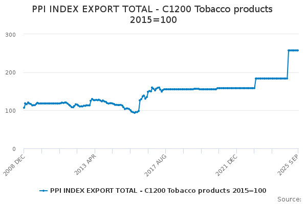 Download this time seriesPPI INDEX EXPORT TOTAL - C1200 Tobacco products 2015=100