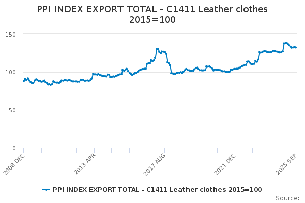 Download this time seriesPPI INDEX EXPORT TOTAL - C1411 Leather clothes 2015=100