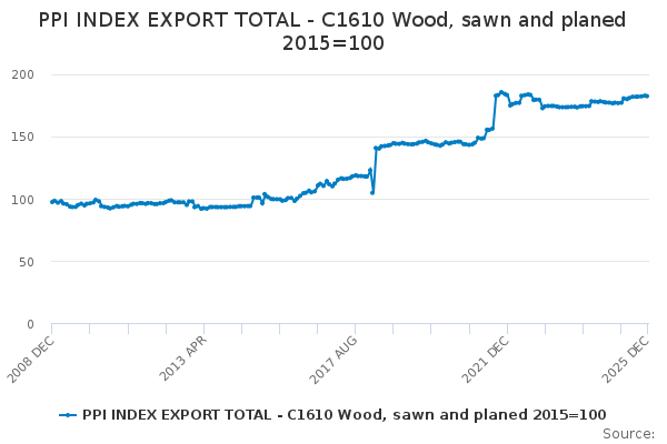 Download this time seriesPPI INDEX EXPORT TOTAL - C1610 Wood, sawn and planed 2015=100
