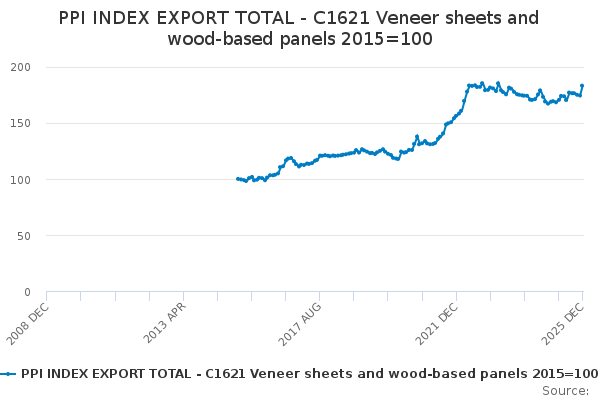 Download this time seriesPPI INDEX EXPORT TOTAL - C1621 Veneer sheets and wood-based panels 2015=100