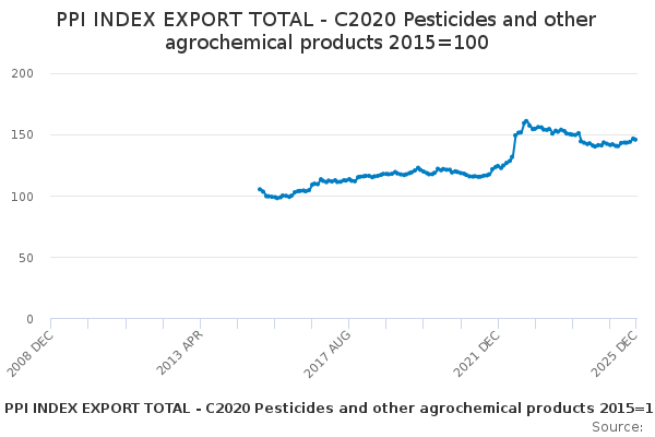 Download this time seriesPPI INDEX EXPORT TOTAL - C2020 Pesticides and other agrochemical products 2015=100