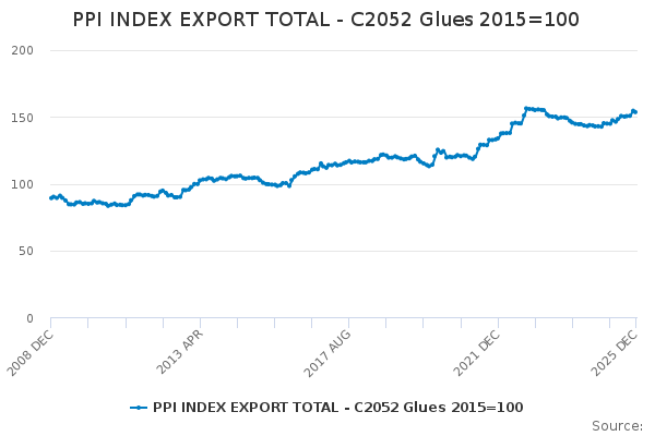 Download this time seriesPPI INDEX EXPORT TOTAL - C2052 Glues 2015=100