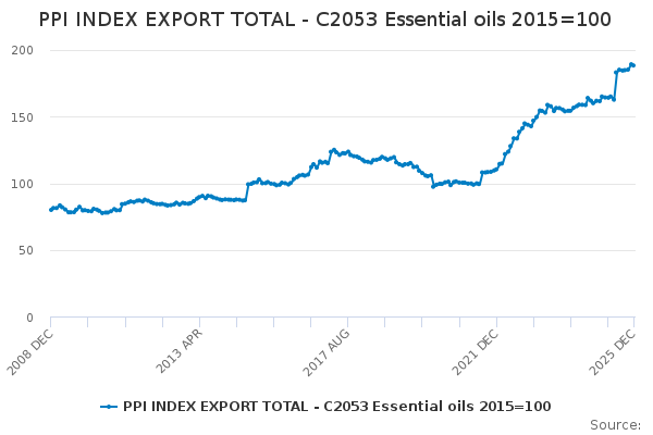 Download this time seriesPPI INDEX EXPORT TOTAL - C2053 Essential oils 2015=100