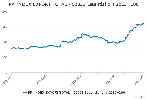 Download this time seriesPPI INDEX EXPORT TOTAL - C2053 Essential oils 2015=100